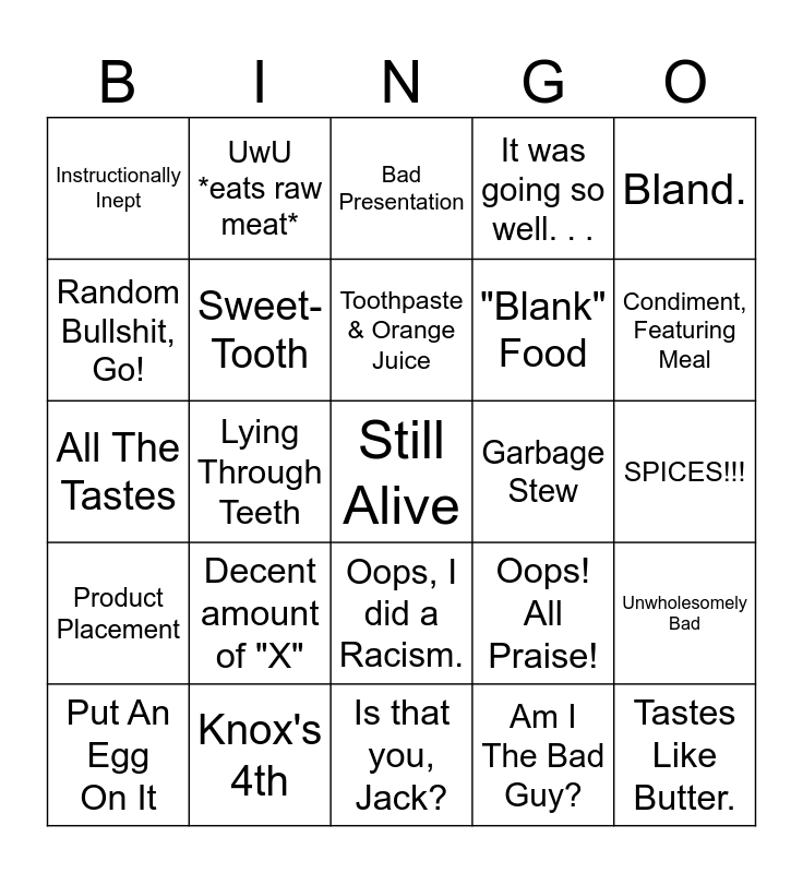 This bingo card has 78 words: Cooking Etiquette, Good Presentation, Bad Presentation, No Cross-Contamination, Cross-Contamination, Bad Kitchen Hygeine, Random Cook Prep, Wrong Utensil, Improper Vessel, Microplastics, Improper Cooking Tool, Suicidal Cooking, It was going so well. . ., Instructionally Inept, Made It Up, Random Bullshit, Go!, Wait? What? How?!, Decent amount of "X", WHERE SPICES???, SPICES!!!, No / Over Marinating, Bland., All The Tastes, Toothpaste & Orange Juice, Sweet-Tooth, Stewed Fruit, Boiling Meat, MAH GREENS!, Chips/Crisps, Soder, Condiment, Featuring Meal, Dangerously Cheesy!, Is that you, Jack?, Tastes Like Butter., Put An Egg On It, Garbage Stew, "Anyone Can Cook", Undercooked Ground Meat, Blue Birdy, Still Alive, Can't Cook Egg, Can't Make Dough, Something's Off, Vomit Inducing, Burnt., UwU *eats raw meat*, ACTUALLY COOKED?!, `Tis Edible, Okay. *sigh* That's fine., Avoidance, Unwholesomely Bad, Lying Through Teeth, Oops! All Praise!, Blatant Narcissim, Biased, Wholesomely Bad, Honesty, Post-Cook Clarity, Held Hostage?, Oops, I did a Racism., "Blank" Food, Unbearable Voice, MMMMMMMMM, Is this a Joke?, Is this a Psy-Op?, ADHD, WTF!?, I cri. ;w;, Product Placement, Knox's 4th, Knox's 8th, Uhm, Ackshually. . ., Hammer Meets Nail, Viewer Overreacts, Am I The Bad Guy?, Am I The Good Guy?, Eat The Rich and SUGAR!!!.