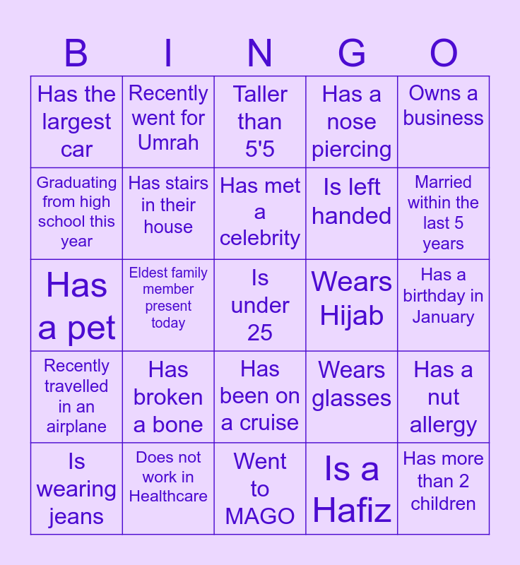 This bingo card has 30 words: Does not work in Healthcare, Youngest family member present today, Eldest family member present today, Works at the hospital, Has the largest car, Taller than 5'5, Has stairs in their house, Has been on a cruise, Wears Hijab, Went to MAGO, Has a birthday in January, Is under 25, Is a Hafiz, Has more than 2 children, Married within the last 5 years, Wears the same shoe size as you, Wears glasses, Recently travelled in an airplane, Has broken a bone, Owns a business, Has a pet, Has an android, Recently went for Umrah, Is left handed, Graduating from high school this year, Has a nose piercing, Has a nut allergy, Is wearing jeans, Has met a celebrity and Cannot speak Urdu.