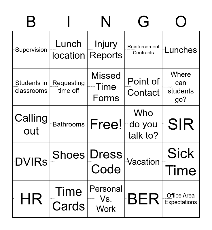 This bingo card has 24 images, a free space and 24 words: Shoes, Time Cards, Missed Time Forms, HR, Lunches, Supervision, Students in classrooms, Lunch location, Who do you talk to?, Dress Code, Point of Contact, Calling out, Vacation, Sick Time, Requesting time off, BER, SIR, Injury Reports, Where can students go?, Bathrooms, Office Area Expectations, DVIRs, Reinforcement Contracts and Personal Vs. Work.