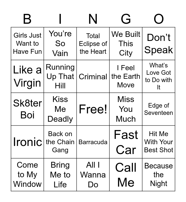 This bingo card has a free space and 31 words: All I Wanna Do, You’re No Good, Kiss Me Deadly, So What, Girls Just Want to Have Fun, Total Eclipse of the Heart, Running Up That Hill, Fast Car, Miss You Much, Call Me, Edge of Seventeen, Because the Night, Piece of My Heart, Rapture, What’s Love Got to Do with It, I Love Rock ‘n’ Roll, Hit Me With Your Best Shot, Back on the Chain Gang, Ironic, Barracuda, Don’t Speak, Here Comes the Rain Again, Come to My Window, You’re So Vain, I Feel the Earth Move, Like a Virgin, We Built This City, Sk8ter Boi, Bring Me to Life, Criminal and RESPECT.