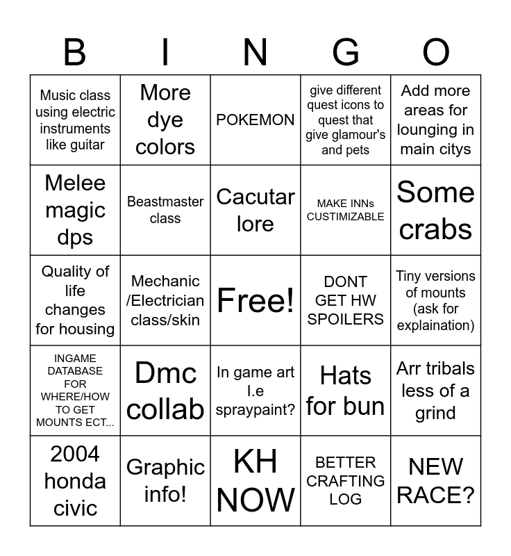 This bingo card has a free space and 24 words: Dmc collab, Graphic info!, Cacutar lore, 2004 honda civic, Add more areas for lounging in main citys, Music class using electric instruments like guitar, Melee magic dps, More dye colors, DONT GET HW SPOILERS, In game art I.e spraypaint?, MAKE INNs CUSTIMIZABLE, Quality of life changes for housing, Hats for bun, Arr tribals less of a grind, Beastmaster class, BETTER CRAFTING LOG, Tiny versions of mounts (ask for explaination), POKEMON, Some crabs, Mechanic /Electrician class/skin, NEW RACE?, INGAME DATABASE FOR WHERE/HOW TO GET MOUNTS ECT..., give different quest icons to quest that give glamour's and pets and KH NOW.