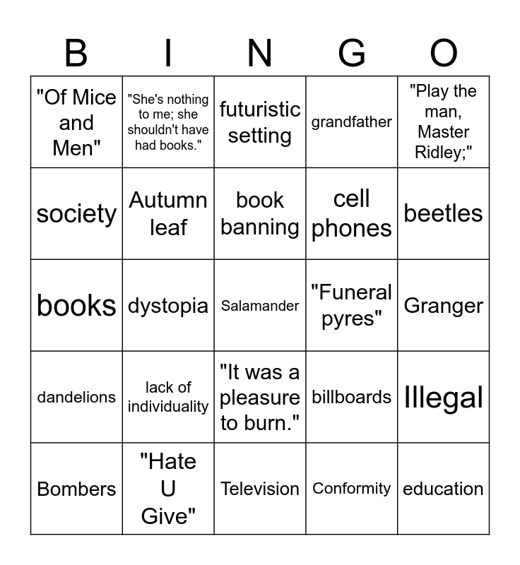 This bingo card has a free space and 104 words: Ray Bradbury, author, book banning, The mechanical hound, Nature, Touching Grass, Use and abuse of Technology, Clarisse, Guy Montag, Mildred, Captain Beatty, "Are You happy?", Sieve, Firefighter, fire proof houses, dark and grim mood, futuristic setting, tone, imagery, burning bright, book censorship, Dover Beach, Parlor walls, censorship, oppressive government, dystopia, Television, cell phones, fire, disconnected relationships, lack of individuality, the pedestrian, social media, loneliness, phoenix, overdose on sleeping pills, war, Faber, beetles, dandelions, Propaganda, "It was a pleasure to burn.", "Your play, Montag.", "Play the man, Master Ridley;", "An ordinary kitchen match.", "She's nothing to me; she shouldn't have had books.", Curiosity, Conformity, flamethrower, Bombers, Denham Dentifrice, "Consider the lilies of the field", rain, critical thinking, a lonely nation, social isolation, community, The Sea of Faith, Poetry, books, Autumn leaf, Mass Media, Live television, Fool, Memory, Helicopters, river, grandfather, Granger, "Of Mice and Men", "Hate U Give", IR Time, "To Kill a Mockingbird", "The Giver", "The Diary of Anne Frank", Knowledge, "Lord of the Flies", "Hollow Fires", "We are not from here", Sand, "the sun burns", "poor family", "Funeral pyres", awakening, society, mental health, depression, denial, school, Message/ warning, social commentary, "pull the trigger", outcast, Illegal, cautionary, truth, coward, billboards, education, Fake History, uncle, alarm, lies and "Tower of Babel".