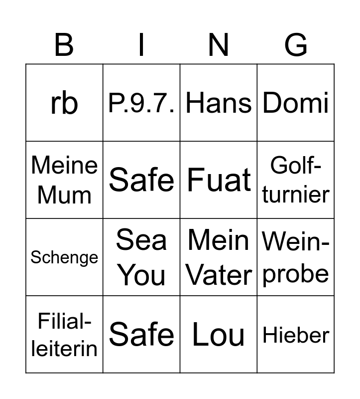 This bingo card has 18 words: Sea You, Hieber, Hans, rb, Mein Vater, Domi, Filial-leiterin, P.9.7., Golf-turnier, Schenge, Lou, Meine Mum, Wein-probe, Safe, Fuat, Golfen, Safe and Mein Vater.