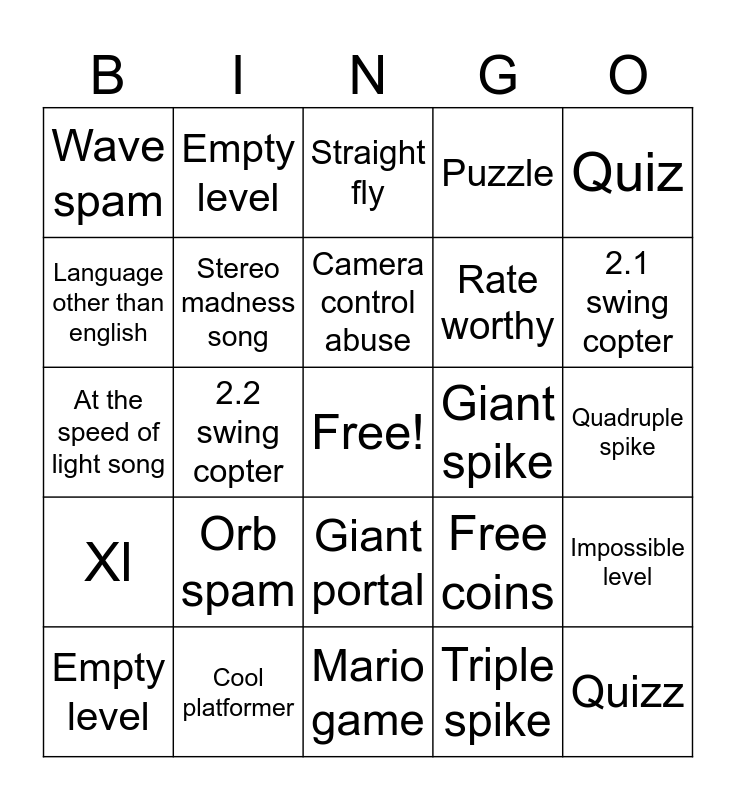 This bingo card has a free space and 24 words: Orb spam, Cool platformer, Camera control abuse, Empty level, Quiz, Wave spam, Language other than english, Empty level, Giant spike, Giant portal, Rate worthy, At the speed of light song, Free coins, Impossible level, Stereo madness song, Triple spike, Quadruple spike, Straight fly, 2.1 swing copter, 2.2 swing copter, Quizz, Xl, Puzzle and Mario game.