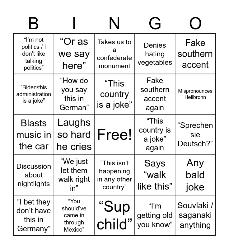This bingo card has a free space and 24 words: “We just let them walk right in”, “You should’ve came in through Mexico”, “This country is a joke”, ”I bet they don’t have this in Germany”, Fake southern accent, “I’m not politics / I don’t like talking politics”, ”Biden/this administration is a joke”, “Or as we say here”, “This country is a joke” again, ”This isn’t happening in any other country”, Fake southern accent again, Blasts music in the car, Says “walk like this”, Any bald joke, “How do you say this in German”, “I’m getting old you know”, “Sprechen sie Deutsch?”, Takes us to a confederate monument, Mispronounces Heilbronn, Laughs so hard he cries, Souvlaki / saganaki anything, Discussion about nightlights, Denies hating vegetables and “Sup child”.