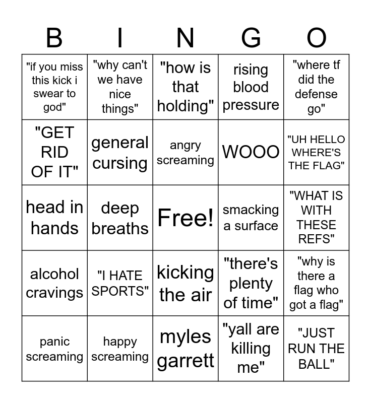 This bingo card has a free space and 24 words: "I HATE SPORTS", happy screaming, angry screaming, panic screaming, "where tf did the defense go", "if you miss this kick i swear to god", "GET RID OF IT", "why can't we have nice things", smacking a surface, kicking the air, WOOO, head in hands, "there's plenty of time", "why is there a flag who got a flag", general cursing, "yall are killing me", "WHAT IS WITH THESE REFS", "how is that holding", "UH HELLO WHERE'S THE FLAG", deep breaths, "JUST RUN THE BALL", alcohol cravings, rising blood pressure and myles garrett.