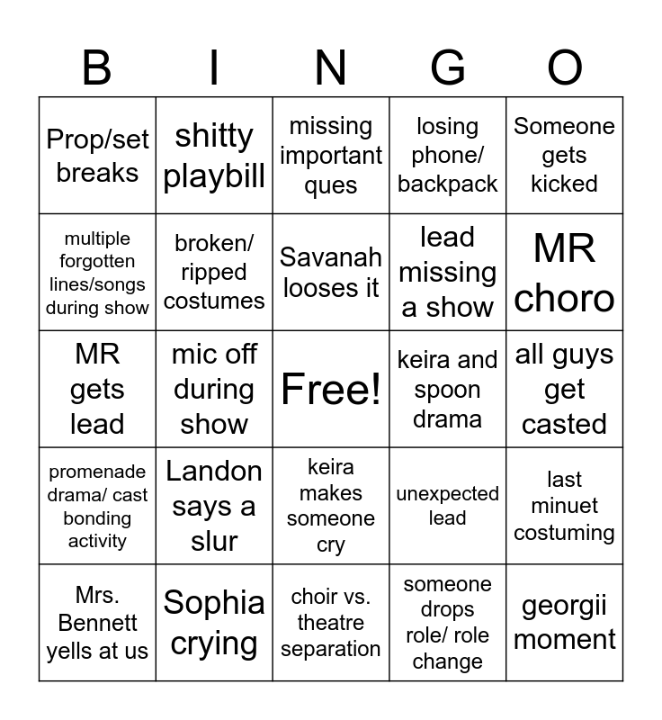 This bingo card has a free space and 24 words: Landon says a slur, Sophia crying, Savanah looses it, Mrs. Bennett yells at us, Someone gets kicked, Prop/set breaks, multiple forgotten lines/songs during show, shitty playbill, keira and spoon drama, keira makes someone cry, lead missing a show, MR gets lead, unexpected lead, last minuet costuming, broken/ ripped costumes, someone drops role/ role change, all guys get casted, missing important ques, MR choro, mic off during show, georgii moment, promenade drama/ cast bonding activity, losing phone/ backpack and choir vs. theatre separation.