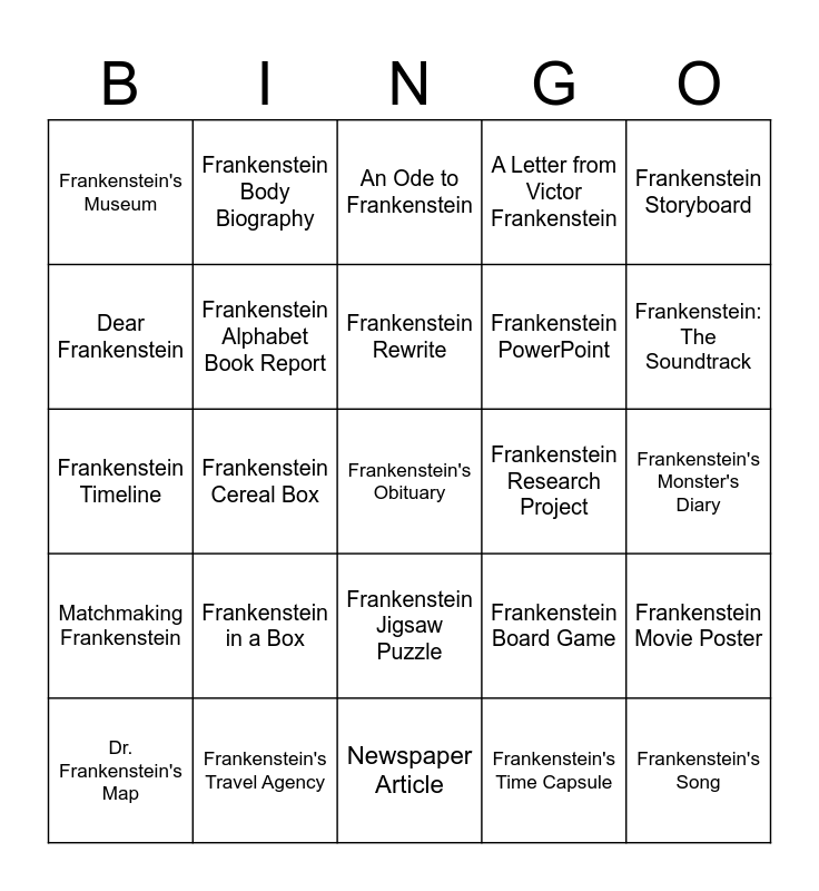 This bingo card has 25 words: Frankenstein in a Box, Newspaper Article, Frankenstein Rewrite, Dr. Frankenstein's Map, Frankenstein Storyboard, Frankenstein's Museum, Dear Frankenstein, Frankenstein Body Biography, Frankenstein Research Project, Frankenstein Jigsaw Puzzle, Frankenstein PowerPoint, Frankenstein Timeline, Frankenstein Board Game, Frankenstein Movie Poster, Frankenstein Alphabet Book Report, Frankenstein's Song, Frankenstein's Monster's Diary, An Ode to Frankenstein, Frankenstein: The Soundtrack, Frankenstein Cereal Box, Frankenstein's Obituary, Frankenstein's Travel Agency, Matchmaking Frankenstein, A Letter from Victor Frankenstein and Frankenstein's Time Capsule.