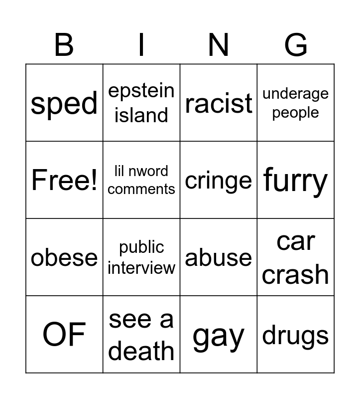 This bingo card has 16 words: see a death, car crash, racist, sped, obese, epstein island, abuse, gay, Free!, lil nword comments, OF, underage people, public interview, furry, cringe and drugs.