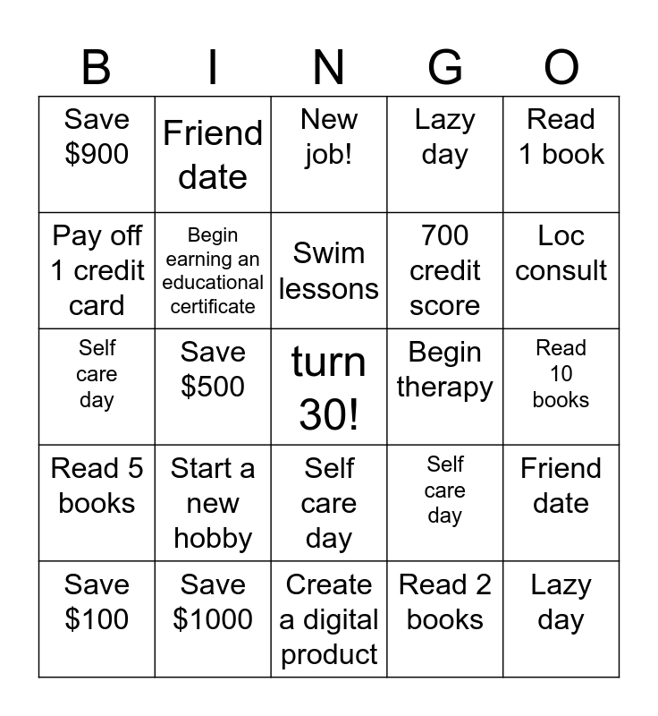 This bingo card has a free space and 29 words: Save $100, Save $300, Save $500, Save $700, Save $900, New job!, Begin earning an educational certificate, Start a new hobby, Begin therapy, Save $1000, Read 10 books, Lazy day, Create a digital product, Read 2 books, Loc consult, Lazy day, Self care day, Read 5 books, Read 1 book, Self care day, Self care day, Self care day, 700 credit score, Pay off 1 credit card, Lazy day, Friend date, Friend date, Swim lessons and 30 mins quiet time/day for 30 days.