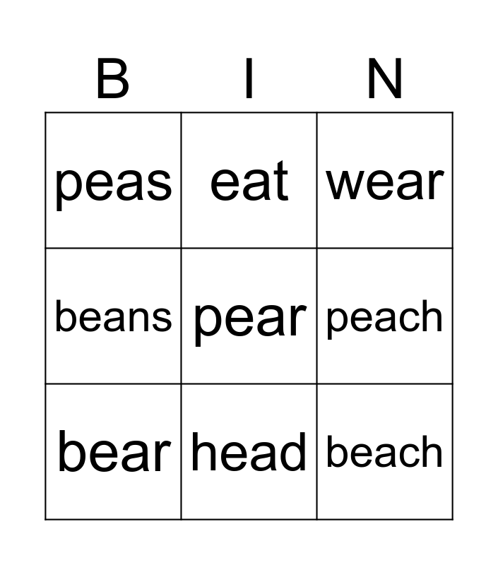 This bingo card has 9 words: bear, wear, eat, beans, peas, peach, pear, beach and head.