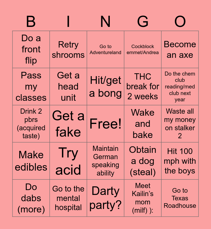 This bingo card has a free space and 24 words: Try acid, Go to the mental hospital, Hit/get a bong, Do dabs (more), Become an axe, Do a front flip, Pass my classes, Retry shrooms, Wake and bake, Maintain German speaking ability, THC break for 2 weeks, Drink 2 pbrs (acquired taste), Obtain a dog (steal), Hit 100 mph with the boys, Get a head unit, Meet Kailin’s mom (milf) ):, Waste all my money on stalker 2, Go to Adventureland, Do the chem club reading/med club next year, Get a fake, Go to Texas Roadhouse, Make edibles, Cockblock emmet/Andrea and Darty party?.