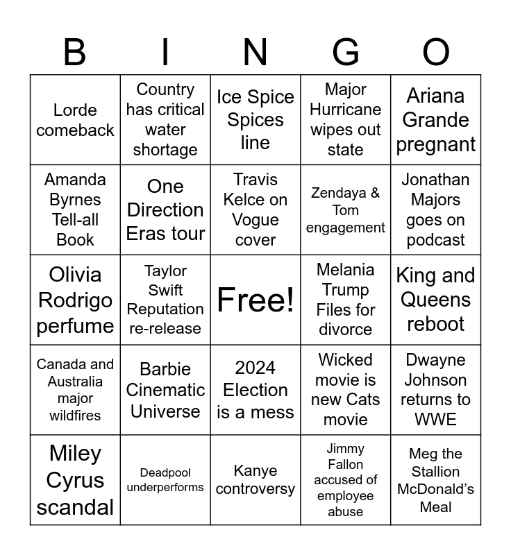 This bingo card has a free space and 24 words: Barbie Cinematic Universe, Deadpool underperforms, Travis Kelce on Vogue cover, Miley Cyrus scandal, Ariana Grande pregnant, Lorde comeback, Amanda Byrnes Tell-all Book, Country has critical water shortage, Melania Trump Files for divorce, 2024 Election is a mess, Zendaya & Tom engagement, Olivia Rodrigo perfume, Wicked movie is new Cats movie, Dwayne Johnson returns to WWE, One Direction Eras tour, Jimmy Fallon accused of employee abuse, King and Queens reboot, Ice Spice Spices line, Jonathan Majors goes on podcast, Taylor Swift Reputation re-release, Meg the Stallion McDonald’s Meal, Canada and Australia major wildfires, Major Hurricane wipes out state and Kanye controversy.