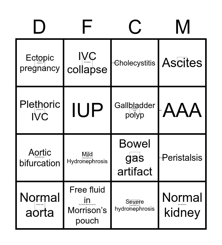 This bingo card has 15 images and 16 words: Free fluid in Morrison’s pouch, Peristalsis, Cholecystitis, Ectopic pregnancy, Aortic bifurcation, IVC collapse, Bowel gas artifact, Severe hydronephrosis, Plethoric IVC, IUP, Normal aorta, Ascites, Mild Hydronephrosis, AAA, Gallbladder polyp and Normal kidney.