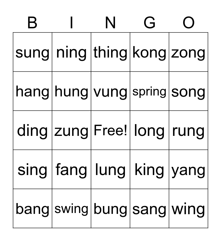 This bingo card has a free space and 29 words: bang, tong, zung, ring, sung, thing, hung, fang, long, swing, rung, wing, bung, sang, song, rang, lung, sing, zong, ding, king, gong, spring, hang, kong, ning, yang, vung and ying.
