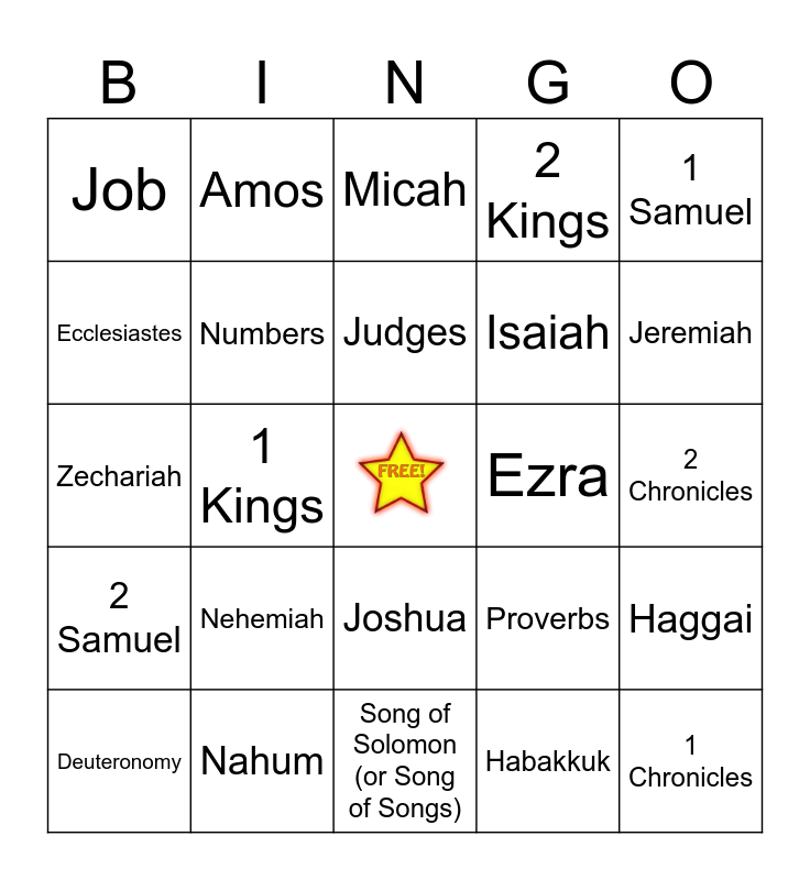 This bingo card has a free space and 39 words: Genesis, Exodus, Leviticus, Numbers, Deuteronomy, Joshua, Judges, Ruth, 1 Samuel, 2 Samuel, 1 Kings, 2 Kings, 1 Chronicles, 2 Chronicles, Ezra, Nehemiah, Esther, Job, Psalms, Proverbs, Ecclesiastes, Song of Solomon (or Song of Songs), Isaiah, Jeremiah, Lamentations, Ezekiel, Daniel, Hosea, Joel, Amos, Obadiah, Jonah, Micah, Nahum, Habakkuk, Zephaniah, Haggai, Zechariah and Malachi.