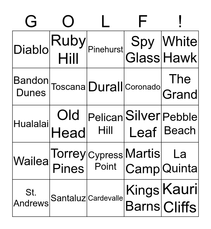 This bingo card has a free space and 24 words: Torrey Pines, Santaluz, Durall, St. Andrews, White Hawk, Diablo, Bandon Dunes, Ruby Hill, Silver Leaf, Cypress Point, Coronado, Hualalai, Martis Camp, La Quinta, Toscana, Kings Barns, Pebble Beach, Pinehurst, The Grand, Old Head, Kauri Cliffs, Wailea, Spy Glass and Cardevalle.