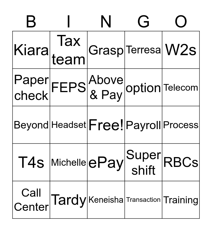 This bingo card has a free space and 24 words: Michelle, Tardy, Above & Pay, Call Center, W2s, Kiara, Paper check, Tax team, Payroll, ePay, option, Beyond, Super shift, RBCs, FEPS, Transaction, Process, Grasp, Telecom, Headset, Training, T4s, Terresa and Keneisha.