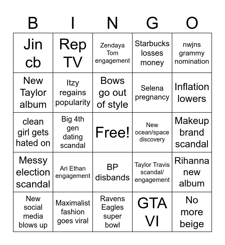 This bingo card has a free space and 24 words: Ari Ethan engagement, Maximalist fashion goes viral, Bows go out of style, New social media blows up, nwjns grammy nomination, Jin cb, New Taylor album, Rep TV, New ocean/space discovery, BP disbands, Selena pregnancy, clean girl gets hated on, Taylor Travis scandal/ engagement, Rihanna new album, Itzy regains popularity, GTA VI, Makeup brand scandal, Zendaya Tom engagement, Inflation lowers, Big 4th gen dating scandal, No more beige, Messy election scandal, Starbucks losses money and Ravens Eagles super bowl.
