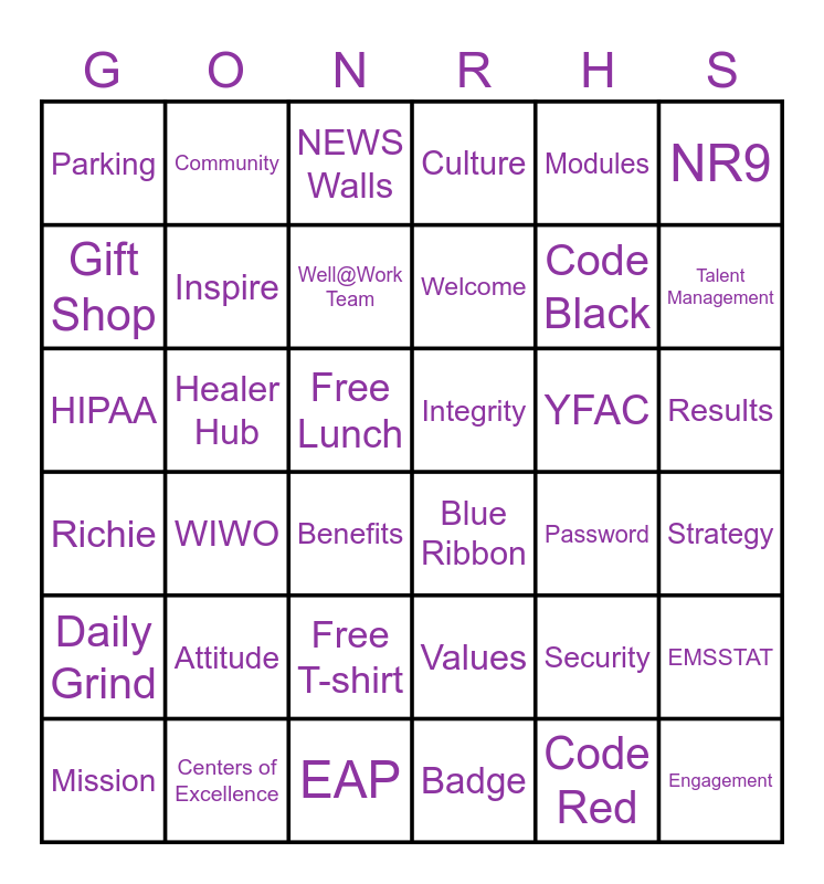 This bingo card has 54 words: Free!, Integrity, Communication, Attitude, Results, Engagement, Culture, HealthPlex, NR9, NR Moore, Parking, Badge, Blue Ribbon, Benefits, Family, Password, HIPAA, Well@Work Team, Gallup, Free Lunch, Richie, Free T-shirt, Healer Hub, Modules, Health Stream, Community, Mission, Vision, Values, Strategy, Payactiv, EAP, Thank you, Dress Code, NEWS Walls, Code Red, Code Black, WIWO, Daily Grind, Gift Shop, Scrub Shop, Health Village, Behavioral Health Center, Healer, YFAC, OU Cancer Partnership, Centers of Excellence, Security, Inspire, Talent Management, Welcome, Healer Breakfast, EMSSTAT and Foundation.