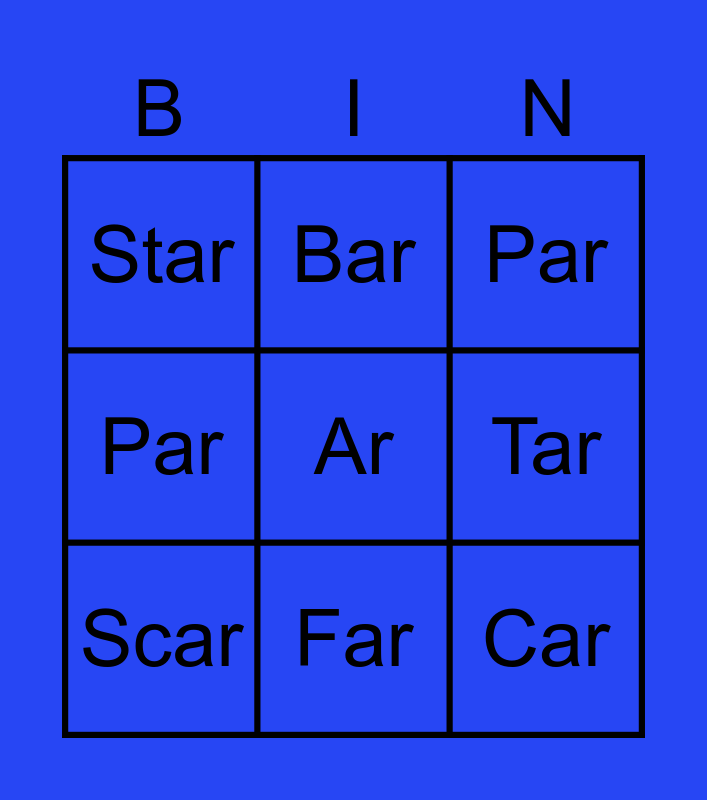 This bingo card has a free space and 8 words: Tar, Par, Bar, Scar, Star, Car, Par and Far.