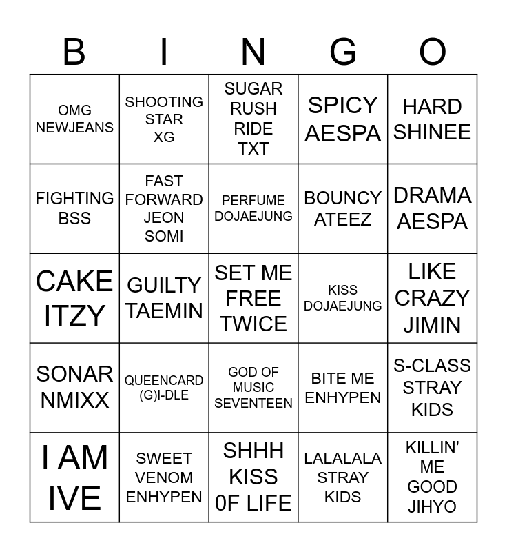 This bingo card has a free space and 49 words: UNFORGIVEN LE SSERAFIM, KILLIN' ME GOOD JIHYO, ICKY KARD, SHHH KISS 0F LIFE, QUEENCARD (G)I-DLE, ETA NEWJEANS, SHOOTING STAR XG, BADDIE IVE, FIGHTING BSS, SUGAR RUSH RIDE TXT, FAST FORWARD JEON SOMI, SPICY AESPA, S-CLASS STRAY KIDS, BITE ME ENHYPEN, BAGGY JEANS NCT U, SUPER SEVENTEEN, PERFUME DOJAEJUNG, KISS DOJAEJUNG, LOVE ME LIKE THIS NMIXX, HARD SHINEE, GUILTY TAEMIN, LALALALA STRAY KIDS, OMG NEWJEANS, BOUNCY ATEEZ, CHASING THAT FEELING TXT, DRAMA AESPA, I AM IVE, CMON JINI, GOD OF MUSIC SEVENTEEN, SONAR NMIXX, YOU & ME JENNIE, MOONLIGHT SUNRISE TWICE, SOCIAL PATH STRAY KIDS, ROLLER COASTER NMIXX, SWEET VENOM ENHYPEN, ROVER KAI, PERFECT NIGHT LE SSERAFIM, GIDDY KEP1ER, LIKE CRAZY JIMIN, 3D JUNGKOOK, BACK FOR MORE TXT, MEMORIES RIIZE, MANIAC VIVIS, WATCH IT THE BOYZ, CAKE ITZY, SUGAR RUSH RIDE TXT, CLOSER JIHYO, FACT CHECK NCT 127 and TALK SAXY RIIZE.