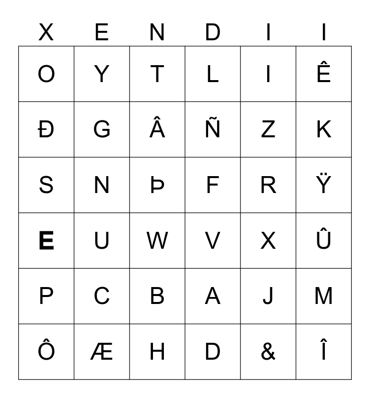 This bingo card has 36 words: A, B, D, Ð, E, F, G, H, I, J, K, L, M, N, Ñ, O, P, R, S, T, Þ, U, V, W, X, Y, Z, Æ, Â, Ê, Î, Ô, Û, Ÿ, C and &.
