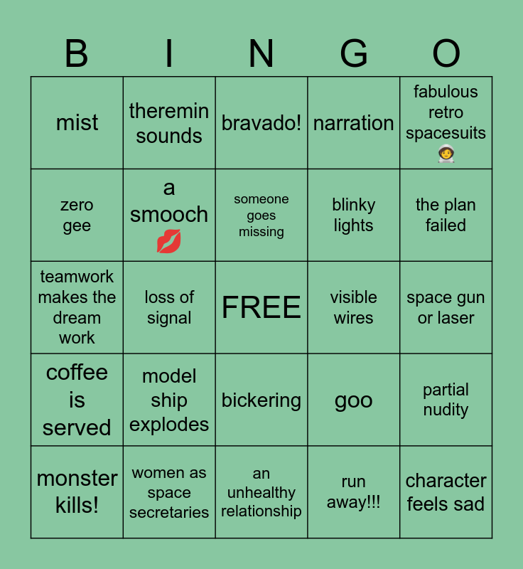 This bingo card has a free space and 24 words: model ship explodes, women as space secretaries, someone goes missing, monster kills!, fabulous retro spacesuits 🧑🚀, mist, zero gee, theremin sounds, visible wires, bickering, blinky lights, teamwork makes the dream work, goo, partial nudity, a smooch 💋, run away!!!, space gun or laser, bravado!, the plan failed, loss of signal, character feels sad, coffee is served, narration and an unhealthy relationship.