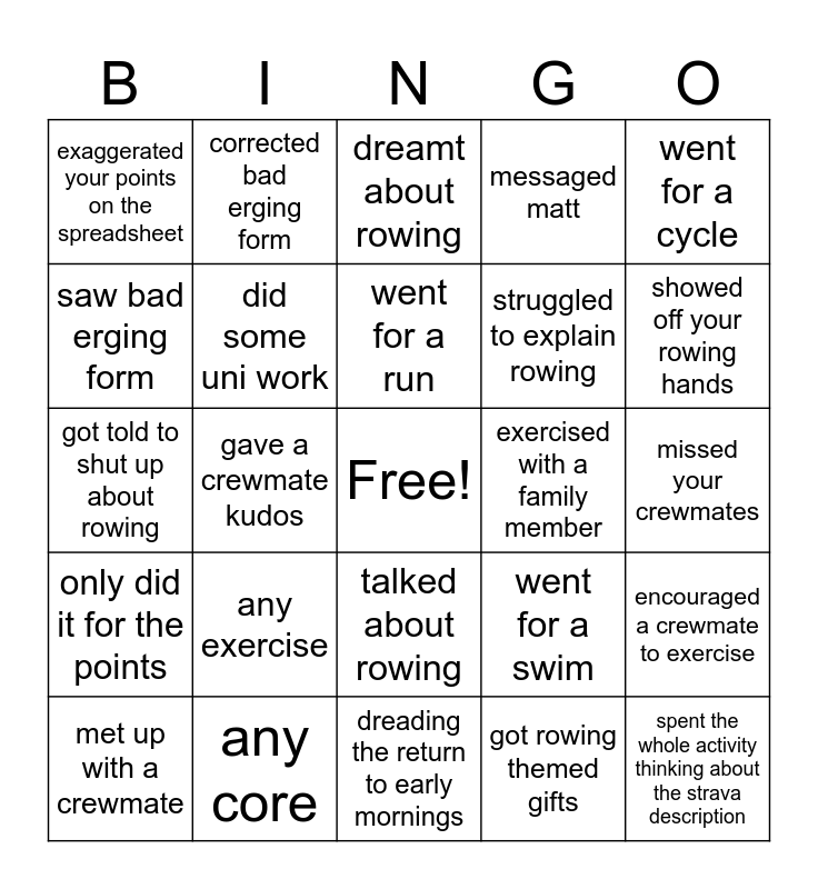 This bingo card has a free space and 24 words: any exercise, any core, went for a run, met up with a crewmate, went for a cycle, exaggerated your points on the spreadsheet, saw bad erging form, corrected bad erging form, exercised with a family member, talked about rowing, struggled to explain rowing, got told to shut up about rowing, went for a swim, encouraged a crewmate to exercise, did some uni work, got rowing themed gifts, missed your crewmates, dreamt about rowing, showed off your rowing hands, gave a crewmate kudos, spent the whole activity thinking about the strava description, only did it for the points, messaged matt and dreading the return to early mornings.
