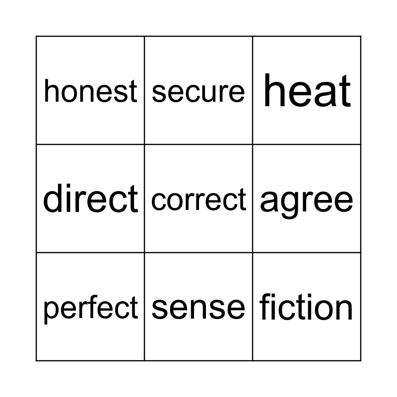This bingo card has 15 words: Free!, polite, heat, honest, sense, correct, pay, stop, agree, fiction, approve, direct, perfect, secure and cook.