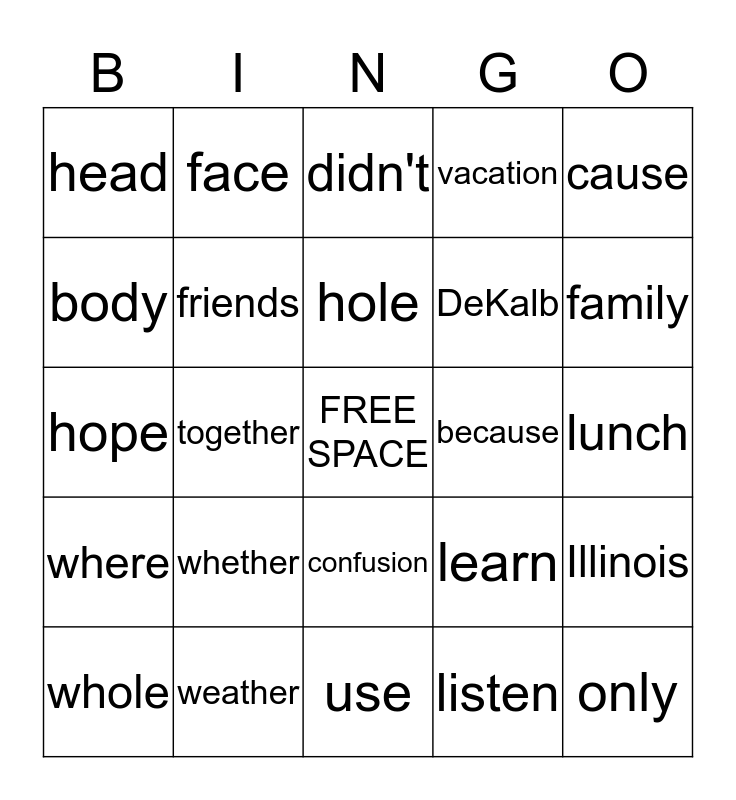 This bingo card has a free space and 24 words: whether, weather, hole, whole, cause, head, body, face, because, confusion, DeKalb, hope, learn, Illinois, friends, listen, lunch, didn't, family, together, only, where, vacation and use.