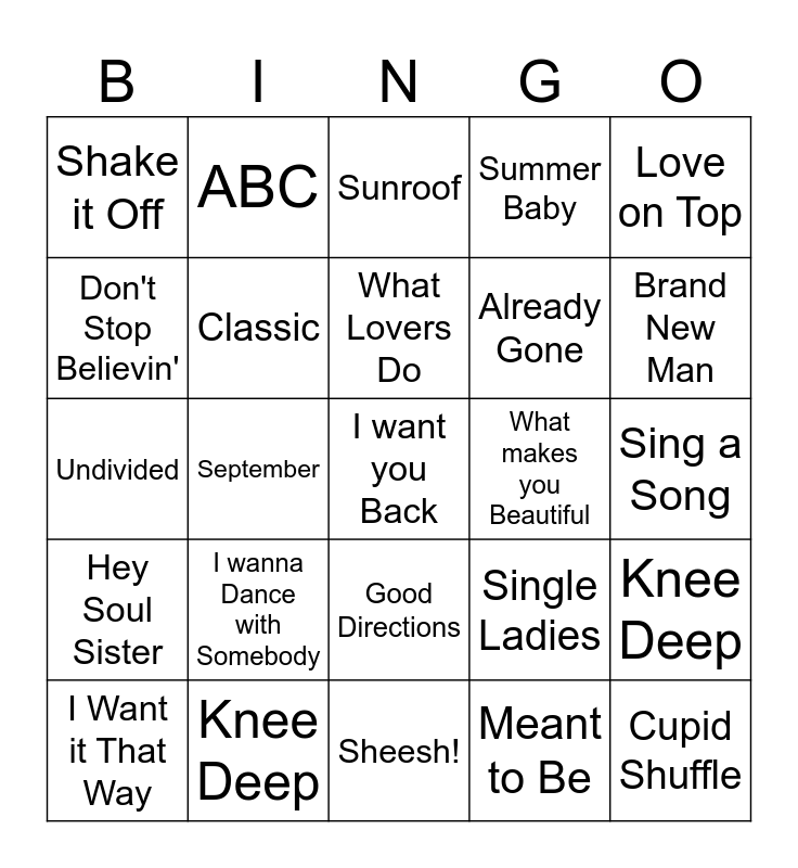 This bingo card has 30 words: Knee Deep, Brand New, September, Everywhere, Shake it Off, Sunroof, Classic, Good Directions, What makes you Beautiful, Sheesh!, Sing a Song, I want you Back, Meant to Be, Cupid Shuffle, Brand New Man, Mr. Blue Sky, Single Ladies, Hey Soul Sister, I wanna Dance with Somebody, Love on Top, Undivided, Casanova, ABC, Already Gone, Don't Stop Believin', Summer Baby, Knee Deep, I Want it That Way, What Lovers Do and Shut Up and Dance.