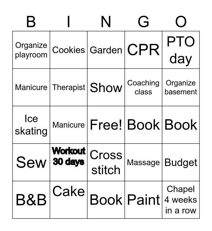 This bingo card has a free space and 24 words: Workout 30 days, Cake, Show, B&B, PTO day, Organize playroom, Manicure, Cookies, Book, Cross stitch, Coaching class, Ice skating, Massage, Budget, Therapist, Paint, Book, Garden, Organize basement, Manicure, Chapel 4 weeks in a row, Sew, CPR and Book.