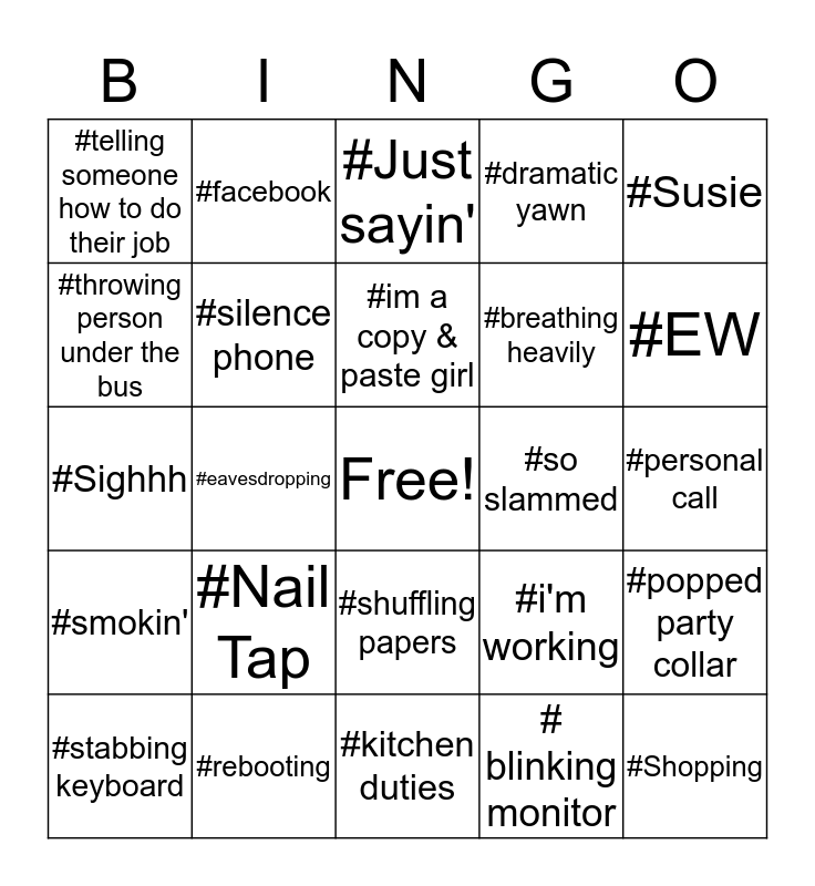 This bingo card has a free space and 24 words: #Nail Tap, #rebooting, #im a copy & paste girl, #stabbing keyboard, #Susie, #telling someone how to do their job, #throwing person under the bus, #facebook, #so slammed, #shuffling papers, #breathing heavily, #Sighhh, #i'm working, #popped party collar, #silence phone, # blinking monitor, #personal call, #Just sayin', #EW, #eavesdropping, #Shopping, #smokin', #dramatic yawn and #kitchen duties.