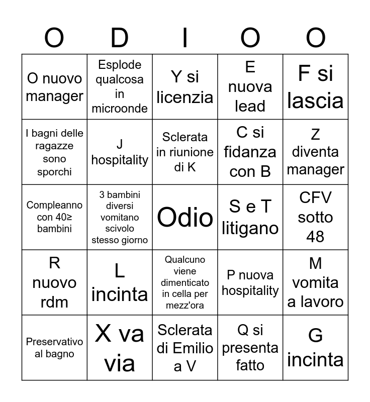 This bingo card has a free space and 24 words: L incinta, X va via, Sclerata in riunione di K, Preservativo al bagno, F si lascia, O nuovo manager, I bagni delle ragazze sono sporchi, Esplode qualcosa in microonde, S e T litigano, Qualcuno viene dimenticato in cella per mezz'ora, C si fidanza con B, Compleanno con 40≥ bambini, P nuova hospitality, M vomita a lavoro, J hospitality, Q si presenta fatto, CFV sotto 48, Y si licenzia, Z diventa manager, 3 bambini diversi vomitano scivolo stesso giorno, G incinta, R nuovo rdm, E nuova lead and Sclerata di Emilio a V.