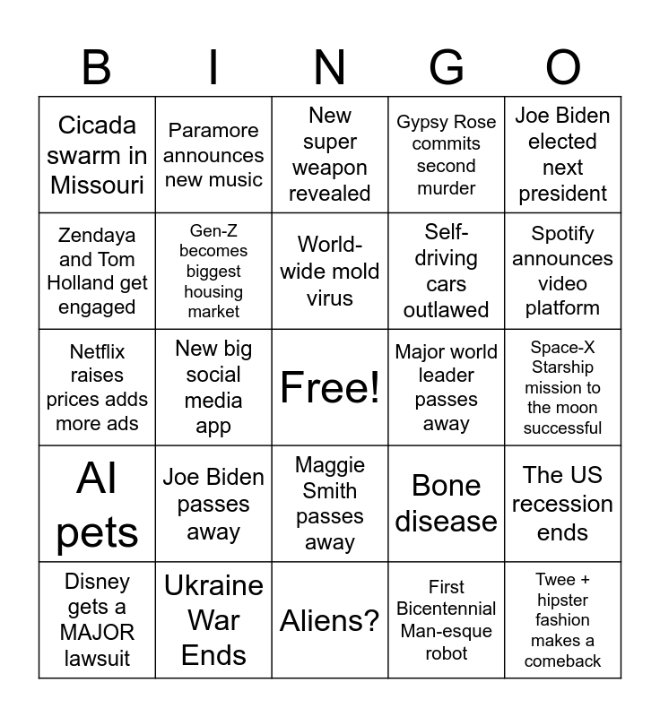 This bingo card has a free space and 24 words: Joe Biden passes away, Ukraine War Ends, World-wide mold virus, Disney gets a MAJOR lawsuit, Joe Biden elected next president, Cicada swarm in Missouri, Zendaya and Tom Holland get engaged, Paramore announces new music, Major world leader passes away, Maggie Smith passes away, Self-driving cars outlawed, Netflix raises prices adds more ads, Bone disease, The US recession ends, Gen-Z becomes biggest housing market, First Bicentennial Man-esque robot, Space-X Starship mission to the moon successful, New super weapon revealed, Spotify announces video platform, New big social media app, Twee + hipster fashion makes a comeback, AI pets, Gypsy Rose commits second murder and Aliens?.