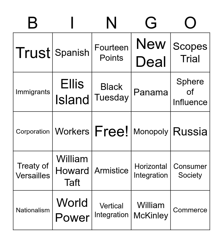 This bingo card has a free space and 24 words: William Howard Taft, World Power, Black Tuesday, Nationalism, Scopes Trial, Trust, Immigrants, Spanish, Monopoly, Armistice, Panama, Corporation, Horizontal Integration, Consumer Society, Ellis Island, William McKinley, Russia, Fourteen Points, Sphere of Influence, Workers, Commerce, Treaty of Versailles, New Deal and Vertical Integration.