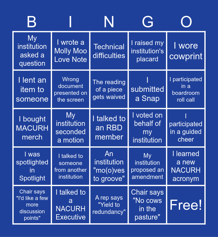 This bingo card has 31 words: A rep says "Yield to redundancy", My institution made a motion, My institution seconded a motion, My institution made a discussion point, My institution asked a question, Technical difficulties, Wrong document presented on the screen, My institution proposed an amendment, I voted on behalf of my institution, Chair says "No cows in the pasture", I participated in a guided cheer, I talked to an RBD member, Free!, I showed off my MACURH merch, I participated in a boardroom roll call, I arrived at boardroom with my laptop fully charged, I learned a new NACURH acronym, I talked to someone from another institution, I was spotlighted in Spotlight, An institution "mo(o)ves to groove", I wore cowprint, Agenda order gets moved around, Chair says "I'd like a few more discussion points", I wrote a Molly Moo Love Note, I submitted a Snap, I lent an item to someone, I raised my institution's placard, I bought MACURH merch, I talked to a NACURH Executive, The reading of a piece gets waived and My institution's name is misspelled or misspoken.
