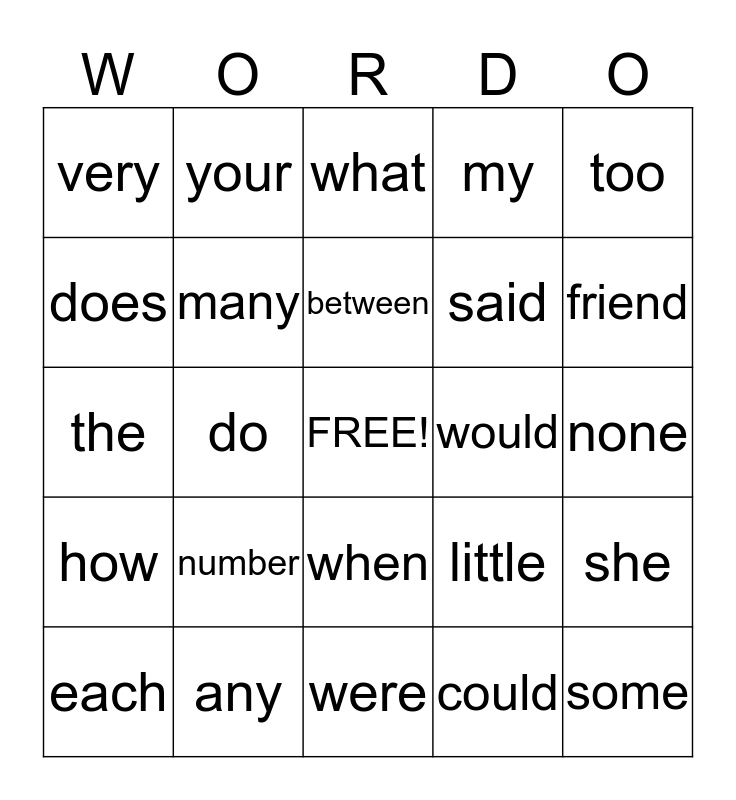 This bingo card has a free space and 24 words: number, any, between, each, too, very, does, your, would, when, said, the, little, she, many, could, none, what, friend, do, some, how, my and were.