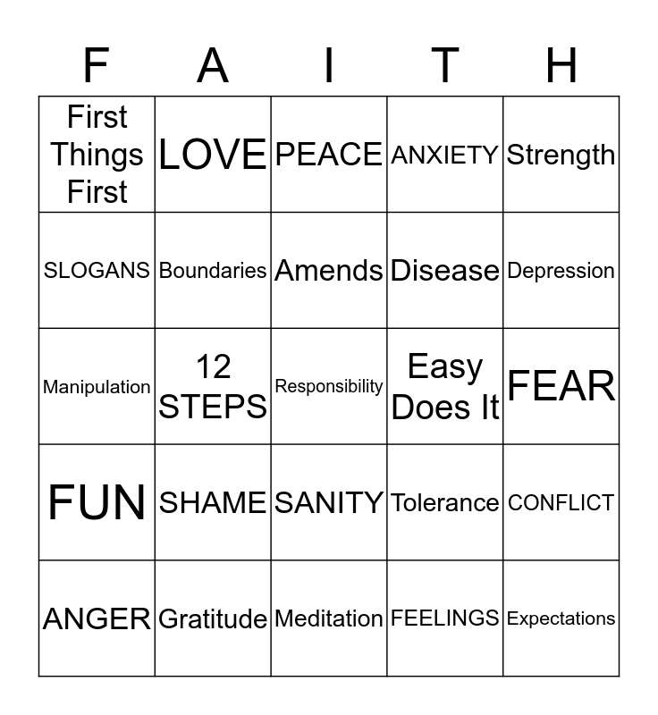 This bingo card has 92 words: Acceptance, Serenity, Meditation, Detachment, Forgiveness, HIGHER POWER, Resentment, ANGER, DENIAL, Inventory, PRAYER, ENABLE, HOPE, Disease, Experience, Strength, PEACE, Addiction, Control, Literature, Anonymity, Humility, LOVE, Obsession, SHAME, Boundaries, Compassion, Expectations, CHOICES, GOD, Gratitude, SANITY, GUILT, HUMOR, LOVE, Surrender, Program, Spiritual Awakening, Amends, Tolerance, Manipulation, FUN, FEAR, Let go & let God, Responsibility, COURAGE, Principles, Traditions, Concepts, Communication, Care-taking, Awareness, MEETINGS, RECOVERY, Powerlessness, Progress, Relationships, SLOGANS, Self-Will, 12 STEPS, BLAME, HAPPINESS, WISDOM, DEFECTS, GRIEF, FEELINGS, MOTIVES, Priorities, SERVICE, Patience, Alcoholism, Co-Dependency, ANXIETY, CHANGE, SPONSOR, FREEDOM, CONFLICT, Qualifier, THINK, One Day at a Time, This too Shall Pass, Easy Does It, First Things First, How Important is it?, Just For Today, Keep It Simple, Live & Let Live, WORRY, RISK, Unmanageable, Depression and JOY.