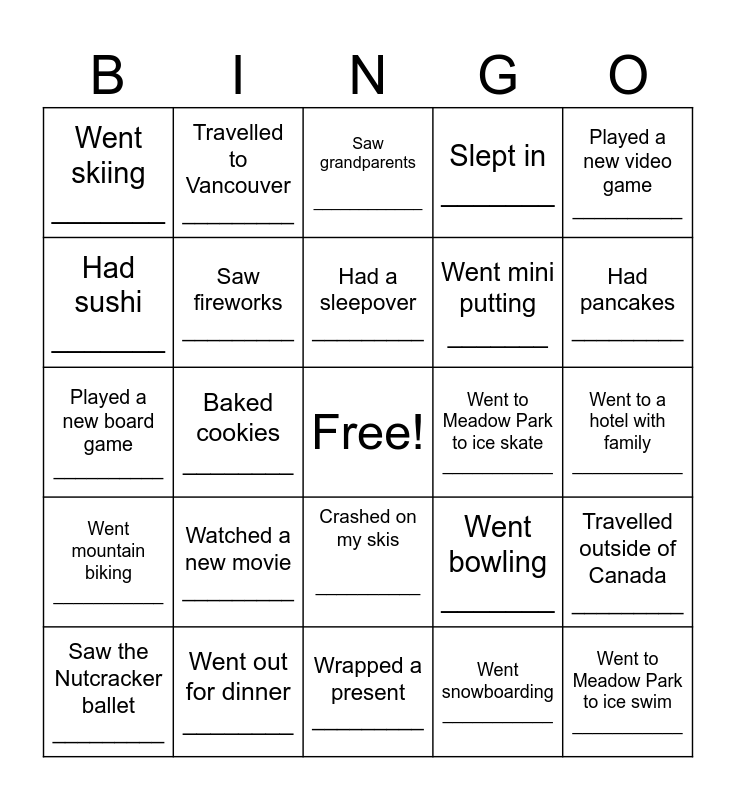 This bingo card has a free space and 24 words: Watched a new movie _________, Went out for dinner ________, Had a sleepover _________, Saw the Nutcracker ballet _________, Played a new video game __________, Went skiing _______, Had sushi _______, Travelled to Vancouver _________, Went to Meadow Park to ice skate ___________, Crashed on my skis __________, Went mini putting _______, Played a new board game __________, Went bowling _______, Travelled outside of Canada _________, Saw fireworks _________, Went snowboarding ___________, Went to a hotel with family ___________, Saw grandparents ____________, Had pancakes _________, Baked cookies ________, Went to Meadow Park to ice swim ___________, Went mountain biking ___________, Slept in _______ and Wrapped a present _________.