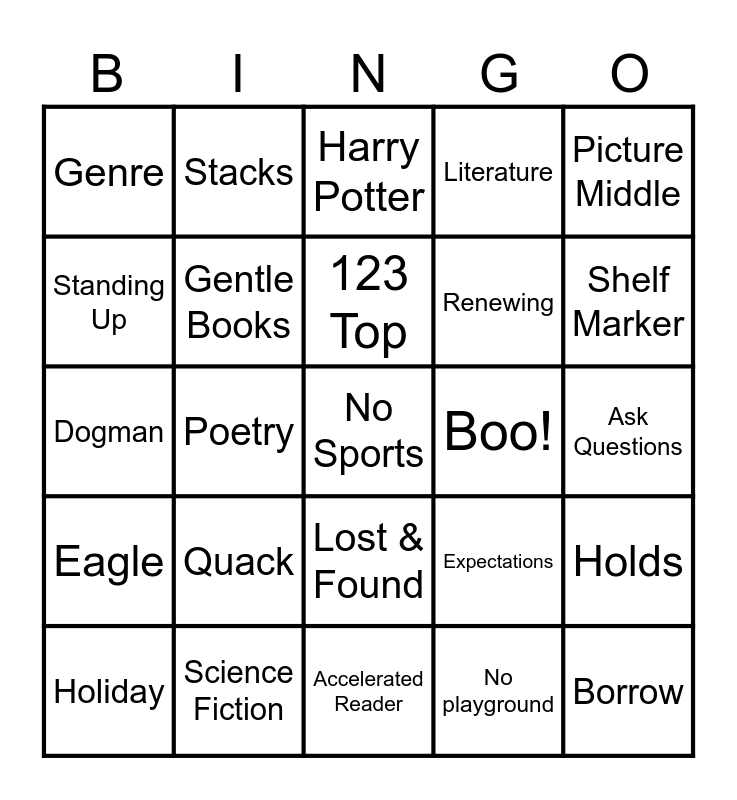 This bingo card has 25 words: Quack, Accelerated Reader, 123 Top, Holiday, Picture Middle, Genre, Standing Up, Stacks, Boo!, Lost & Found, Renewing, Dogman, Expectations, Holds, Gentle Books, Borrow, Ask Questions, Harry Potter, Shelf Marker, Poetry, No Sports, Science Fiction, Eagle, Literature and No playground.
