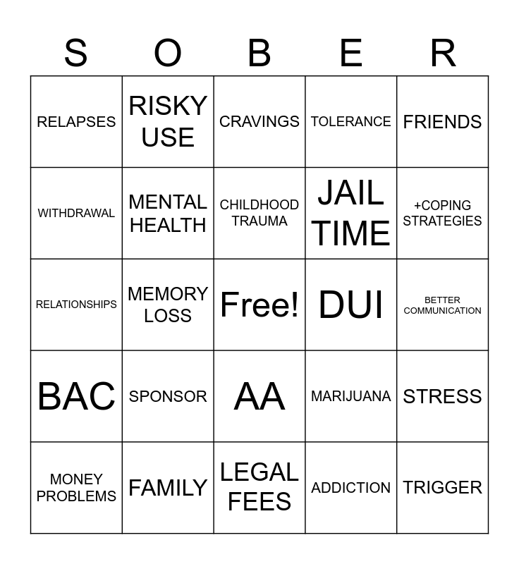 This bingo card has a free space and 29 words: MONEY PROBLEMS, INHALANTS, MEMORY LOSS, ALCOHOL, RELAPSES, CRAVINGS, MENTAL HEALTH, SPONSOR, DUI, FAMILY, BETTER COMMUNICATION, TRIGGER, LEGAL FEES, ADDICTION, +COPING STRATEGIES, METH, AA, BAC, FRIENDS, RELATIONSHIPS, MARIJUANA, NA, JAIL TIME, WITHDRAWAL, TOLERANCE, RISKY USE, STRESS, CHILDHOOD TRAUMA and PEER PRESSURE.