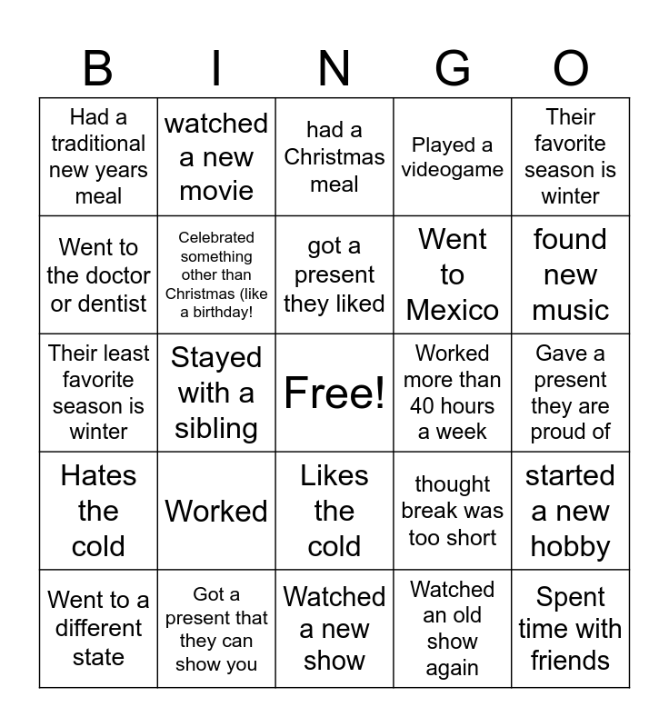 This bingo card has a free space and 29 words: Went to a different state, Went to a different country, Stayed with a sibling, Stayed with an aunt or uncle, Had a traditional new years meal, had a Christmas meal, Celebrated something other than Christmas (like a birthday!, Worked, Worked more than 40 hours a week, Got a present that they can show you, Gave a present they are proud of, Spent time with friends, Watched a new show, Watched an old show again, found new music, listened to old music, Likes the cold, Hates the cold, Their favorite season is winter, Their least favorite season is winter, thought break was too short, thought break was too long, Went to Mexico, Went to the doctor or dentist, Played a videogame, watched a new movie, started a new hobby, got a present they liked and left early for break so missed finals LOL.