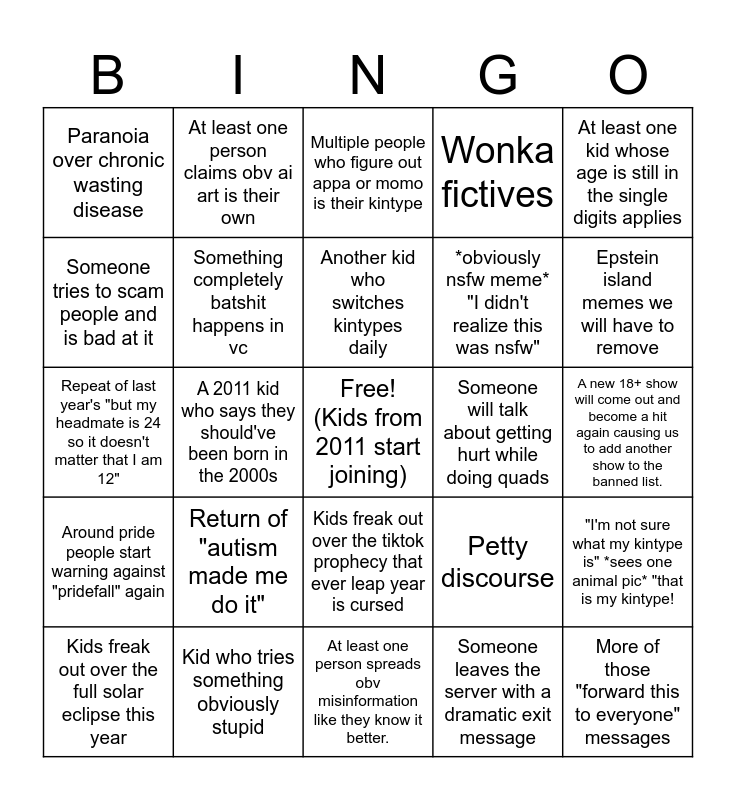 This bingo card has a free space and 24 words: Return of "autism made me do it", Kid who tries something obviously stupid, Another kid who switches kintypes daily, Kids freak out over the full solar eclipse this year, At least one kid whose age is still in the single digits applies, Paranoia over chronic wasting disease, Someone tries to scam people and is bad at it, At least one person claims obv ai art is their own, Someone will talk about getting hurt while doing quads, Kids freak out over the tiktok prophecy that ever leap year is cursed, *obviously nsfw meme* "I didn't realize this was nsfw", Repeat of last year's "but my headmate is 24 so it doesn't matter that I am 12", Petty discourse, "I'm not sure what my kintype is" *sees one animal pic* "that is my kintype!, Something completely batshit happens in vc, Someone leaves the server with a dramatic exit message, A new 18+ show will come out and become a hit again causing us to add another show to the banned list., Multiple people who figure out appa or momo is their kintype, Epstein island memes we will have to remove, A 2011 kid who says they should've been born in the 2000s, More of those "forward this to everyone" messages, Around pride people start warning against "pridefall" again, Wonka fictives and At least one person spreads obv misinformation like they know it better..