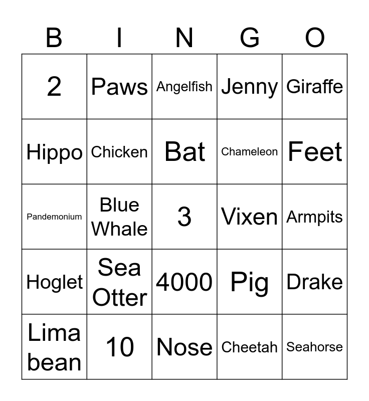 This bingo card has 25 words: Sea Otter, Nose, Bat, Lima bean, Giraffe, 2, Hippo, Paws, Vixen, 4000, Chameleon, Pandemonium, Pig, Drake, Chicken, Seahorse, Armpits, Angelfish, Feet, Blue Whale, 3, 10, Hoglet, Jenny and Cheetah.