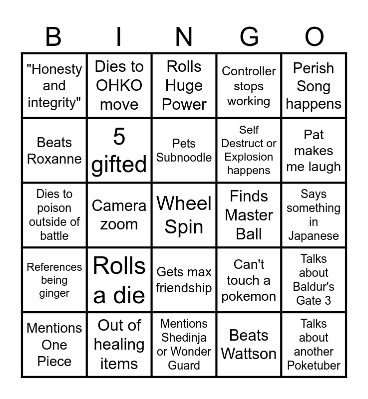 This bingo card has 37 words: New run, Destiny Bond happens, Gamer Supps plug, 5 gifted, Talks about Baldur's Gate 3, Rolls a die, Pets Subnoodle, Nickname is claimed, Perish Song happens, Leo appearance, Camera zoom, Controller stops working, Wheel Spin, Says something in Japanese, Beats Roxanne, References being ginger, Talks about a Then We Fight, Rolls Huge Power, Gets max friendship, Finds Master Ball, "Honesty and integrity", Pat makes me laugh, Mentions One Piece, Mentions Shedinja or Wonder Guard, God Noodle, Beats Wattson, Dies to OHKO move, Accidentally KOs a wild mon, "Chat type 1", Asks Siri a question, 20+ gifted by a single person, Out of healing items, Dies to poison outside of battle, Talks about another Poketuber, Can't touch a pokemon, Self Destruct or Explosion happens and Uses a Mega Evolution.