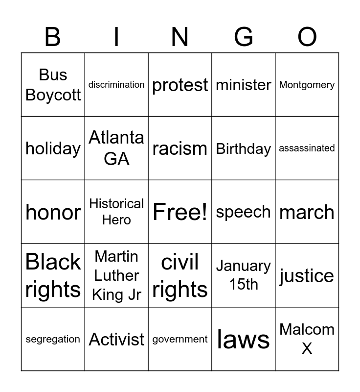 This bingo card has a free space and 24 words: Martin Luther King Jr, Activist, racism, segregation, Montgomery, Bus Boycott, holiday, discrimination, speech, civil rights, Birthday, honor, January 15th, justice, Atlanta GA, laws, march, protest, assassinated, Historical Hero, Malcom X, Black rights, minister and government.