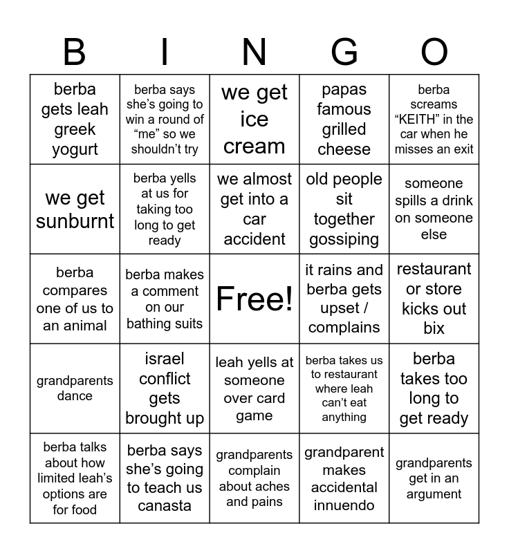This bingo card has a free space and 24 words: israel conflict gets brought up, berba says she’s going to teach us canasta, we almost get into a car accident, berba talks about how limited leah’s options are for food, berba screams “KEITH” in the car when he misses an exit, berba gets leah greek yogurt, we get sunburnt, berba says she’s going to win a round of “me” so we shouldn’t try, it rains and berba gets upset / complains, leah yells at someone over card game, old people sit together gossiping, berba compares one of us to an animal, berba takes us to restaurant where leah can’t eat anything, berba takes too long to get ready, berba yells at us for taking too long to get ready, grandparent makes accidental innuendo, restaurant or store kicks out bix, we get ice cream, someone spills a drink on someone else, berba makes a comment on our bathing suits, grandparents get in an argument, grandparents dance, papas famous grilled cheese and grandparents complain about aches and pains.