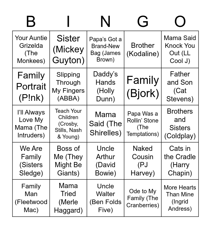 This bingo card has 60 words: The Greatest Man I Never Knew (Reba McEntire), Mama Tried (Merle Haggard), Sisters (Rosemary Clooney, Betty Clooney), We Are Family (Sisters Sledge), Ode to My Family (The Cranberries), He Ain’t Heavy, He’s My Brother (The Hollies), Slipping Through My Fingers (ABBA), The Family Madrigal (Stephanie Beatriz), Family (Bjork), Papa Don’t Preach (Madonna), Brother (Kodaline), Hey Brother (Avicii), Family Portrait (P!nk), Sister Christian (Night Ranger), Sisters Are Doin’ It For Themselves (Eurythmics), Your Auntie Grizelda (The Monkees), Mama Said (The Shirelles), Mama Said Knock You Out (LL Cool J), Shame and Scandal (Trini Lopez), Daddy’s Hands (Holly Dunn), Papa Was a Rollin’ Stone (The Temptations), Papa’s Got a Brand-New Bag (James Brown), Family Man (Fleetwood Mac), Cats in the Cradle (Harry Chapin), Family Business (Kanye West), Family Man (Hall & Oates), Daughters (John Mayer), Mama I’m Coming Home (Ozzy Osbourne), Father and Son (Cat Stevens), A Song For Mama (Boyz II Men), Keep the Family Close (Drake), Dear Mama (2Pac), Father Figure (George Michael), Uncle Jonny (The Killers), Sister (Mickey Guyton), Chosen Family (Rina Sawayama, Elton John), Piece By Piece (Kelly Clarkson), Teach Your Children (Crosby, Stills, Nash & Young), Family Affair (Sly & The Family Stone), I’ll Always Love My Mama (The Intruders), Blood Brothers (Iron Maiden), Boss of Me (They Might Be Giants), Brothers and Sisters (Coldplay), Cousins (Vampire Weekend), Naked Cousin (PJ Harvey), Everybody’s Got a Cousin in Miami (Jimmy Buffet), I’m My Own Grandpa (Ray Stevens), Grandma’s Feather Bed (John Denver), Aunt Dora’s Love Soul Shack (Arthur Conley), Uncle Arthur (David Bowie), Uncle Walter (Ben Folds Five), Uncle Joe (Buffy St. Marie), Uncle John’s Band (Grateful Dead), My Mother-In-Law (Etta James), Father to Son (Queen), Father and Daughter (Paul Simon), Dance With My Father (Luther Vandross), My Little Girl (Tim McGraw), More Hearts Than Mine (Ingrid Andress) and My Father’s Eyes (Eric Clapton).